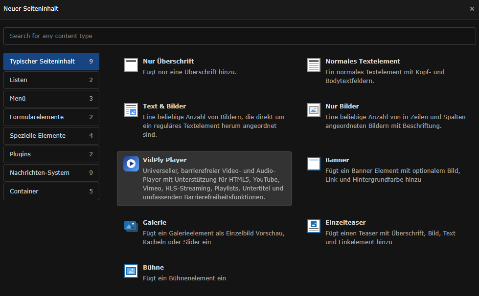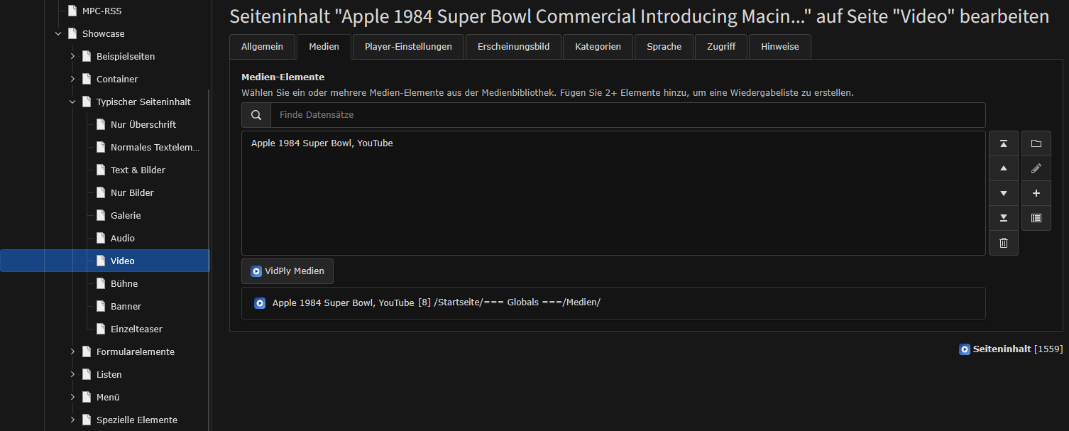 Fügen Sie anschließend ein VidPly Player-Inhaltselement auf der Seite hinzu, auf der Sie das Video ausgeben möchten und wählen Sie Ihre Medien Datensatz aus.