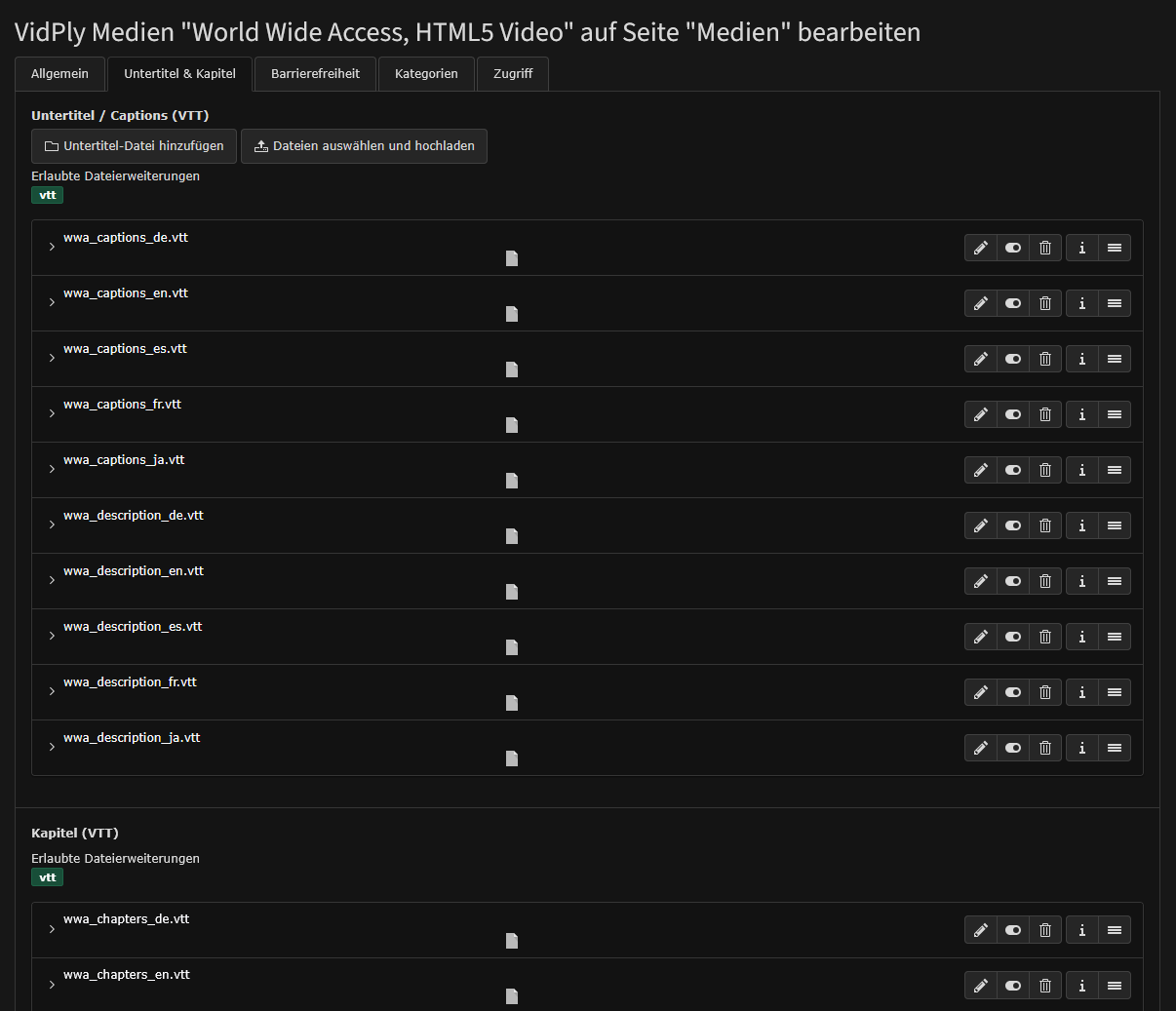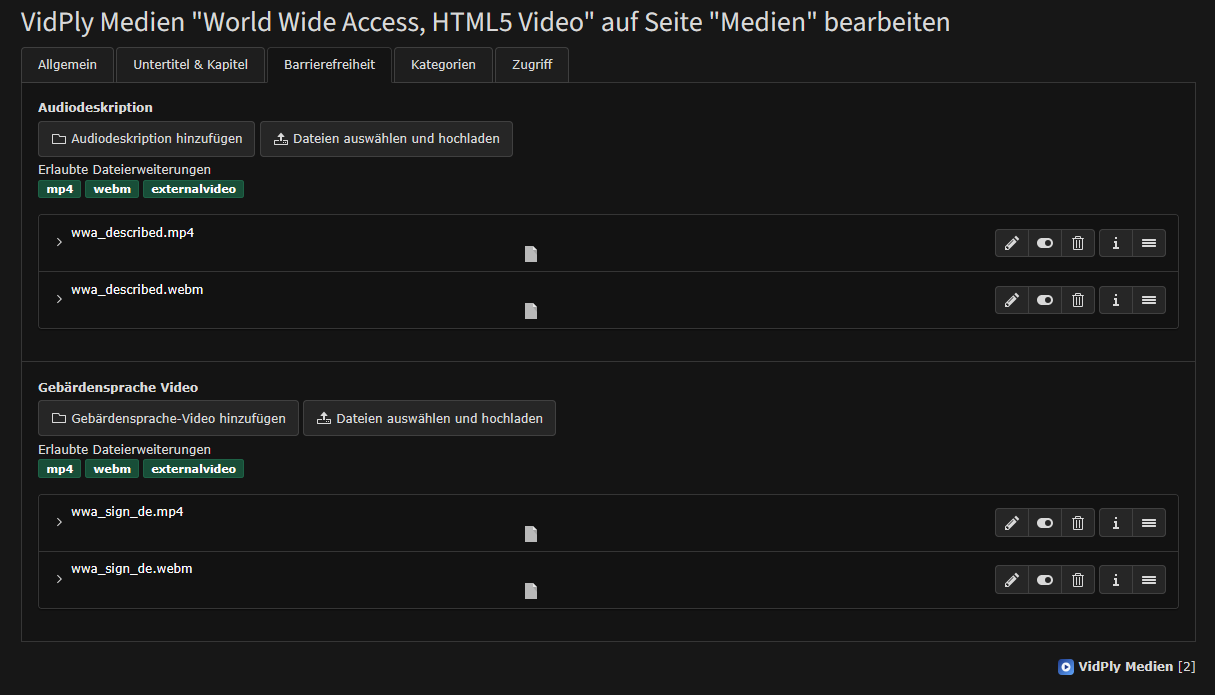 Hier können Sie Ihr Medienelement anlegen. Ihm einen Namen geben, ein Vorschaubild zuteilen und alle anderen Einstellungen vornehmen. Sie können auch Captions, Deskriptionen, ein Gebärdensprache Video und eine Audio-Deskriptions-Video hinzufügen.